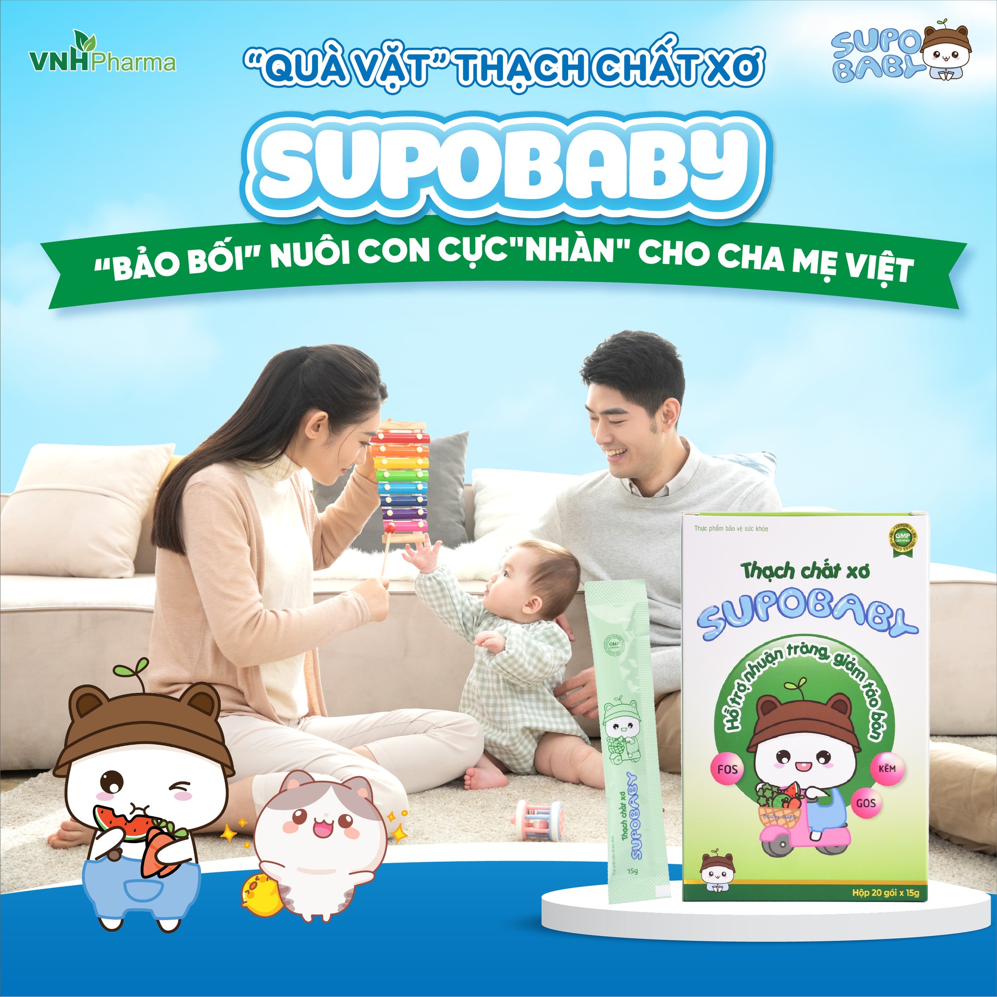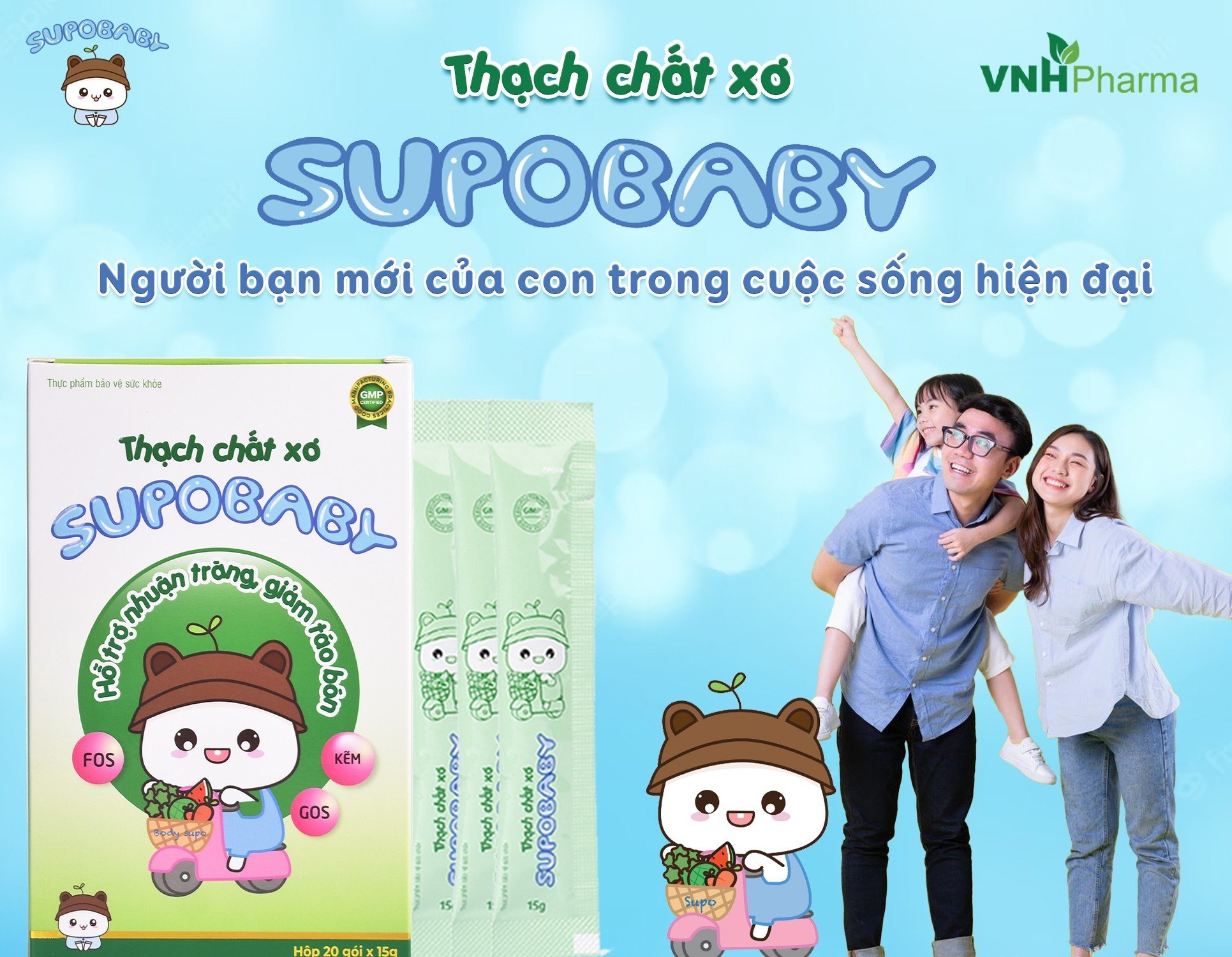 Thạch chất xơ Supobaby được nghiên cứu và phát triển bởi các chuyên gia hàng đầu VNHPharma. Ngoài những bài tập giảm táo bón tại nhà ba mẹ cho con sử dụng thạch chất xơ của VNHPharma giúp con giảm táo bón, tăng cường chức năng hệ tiêu hoá toàn diện, cân bằng hệ vi sinh đường ruột tự nhiên cho trẻ.